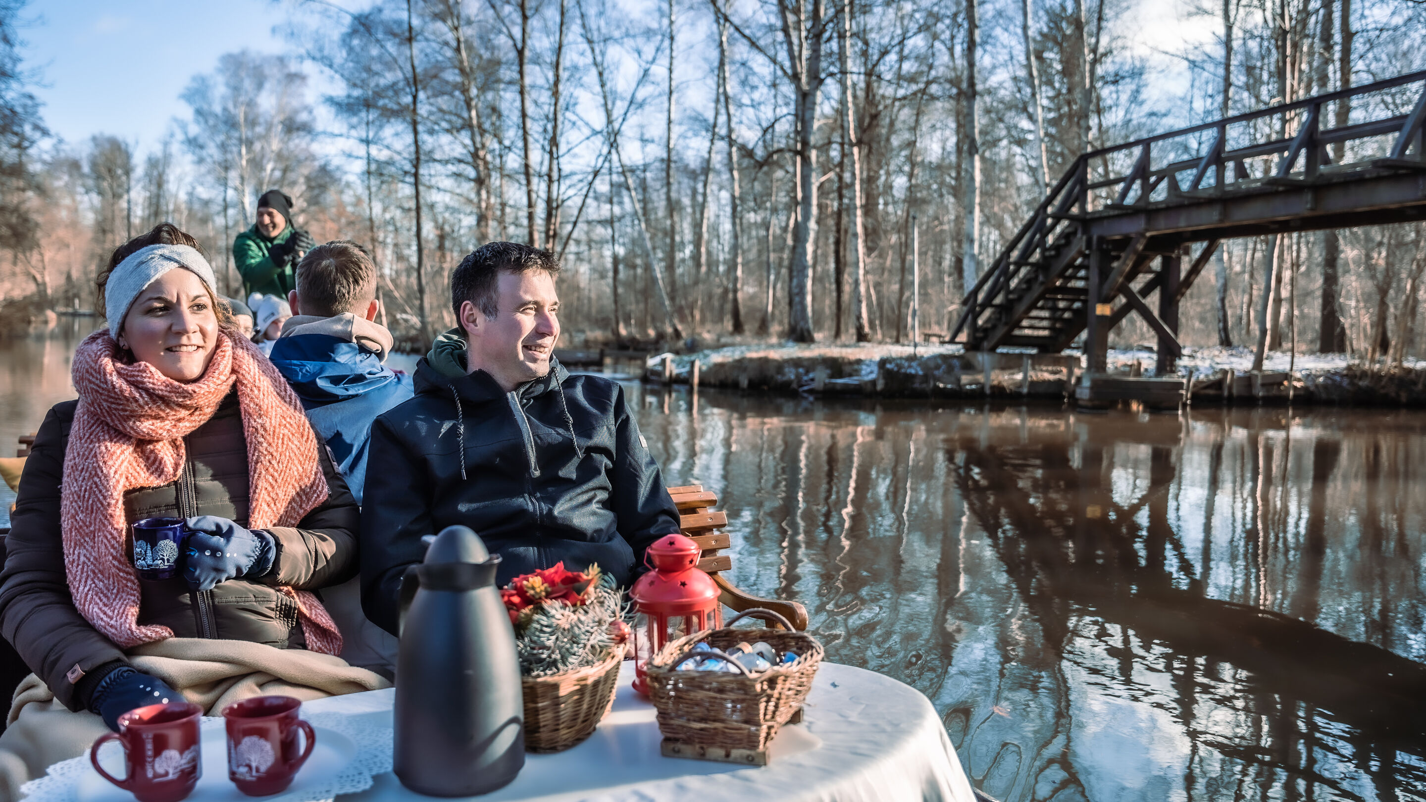 Eingehüllt in warme Decken, in der Hand ein warmes Getränk, den Blick in die Ferne schweifen lassen - Genießen Sie Ruhe und Weite bei einer Winterkahnfahrt!